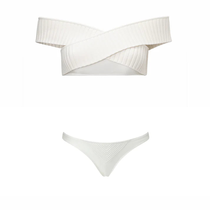 This modern bikini features an off-the-shoulder top with crisscross bands, providing a unique and elegant look. The high-waisted bottom has a cut-out detail and buttons at the back, adding a touch of sophistication and style.
