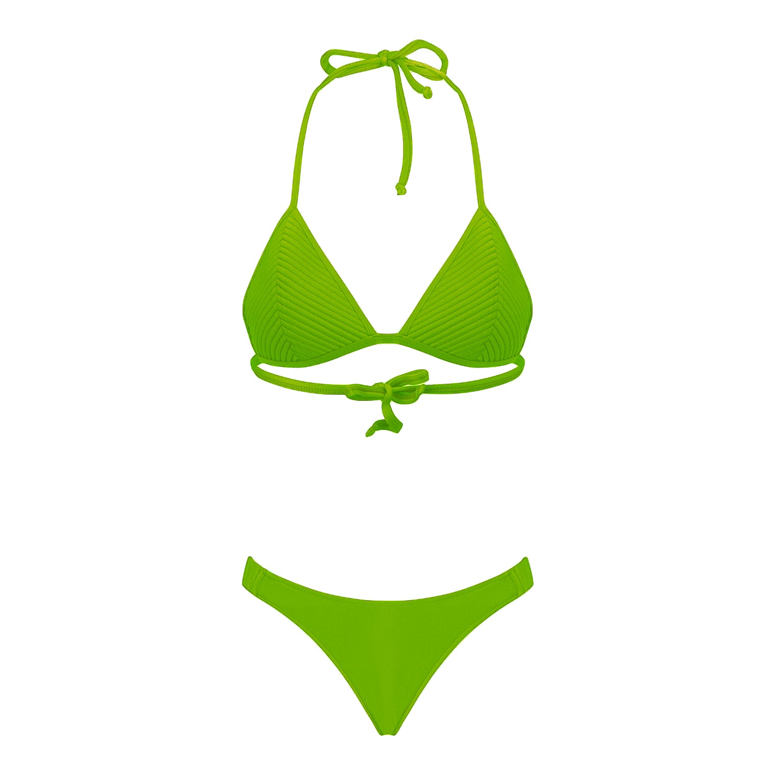 This vibrant bikini is designed for those who want a combination of style and comfort. The triangle top features structured cups with textured detailing, providing both support and a fashionable look. It comes with adjustable ties at the neck and back, ensuring a customizable and secure fit.